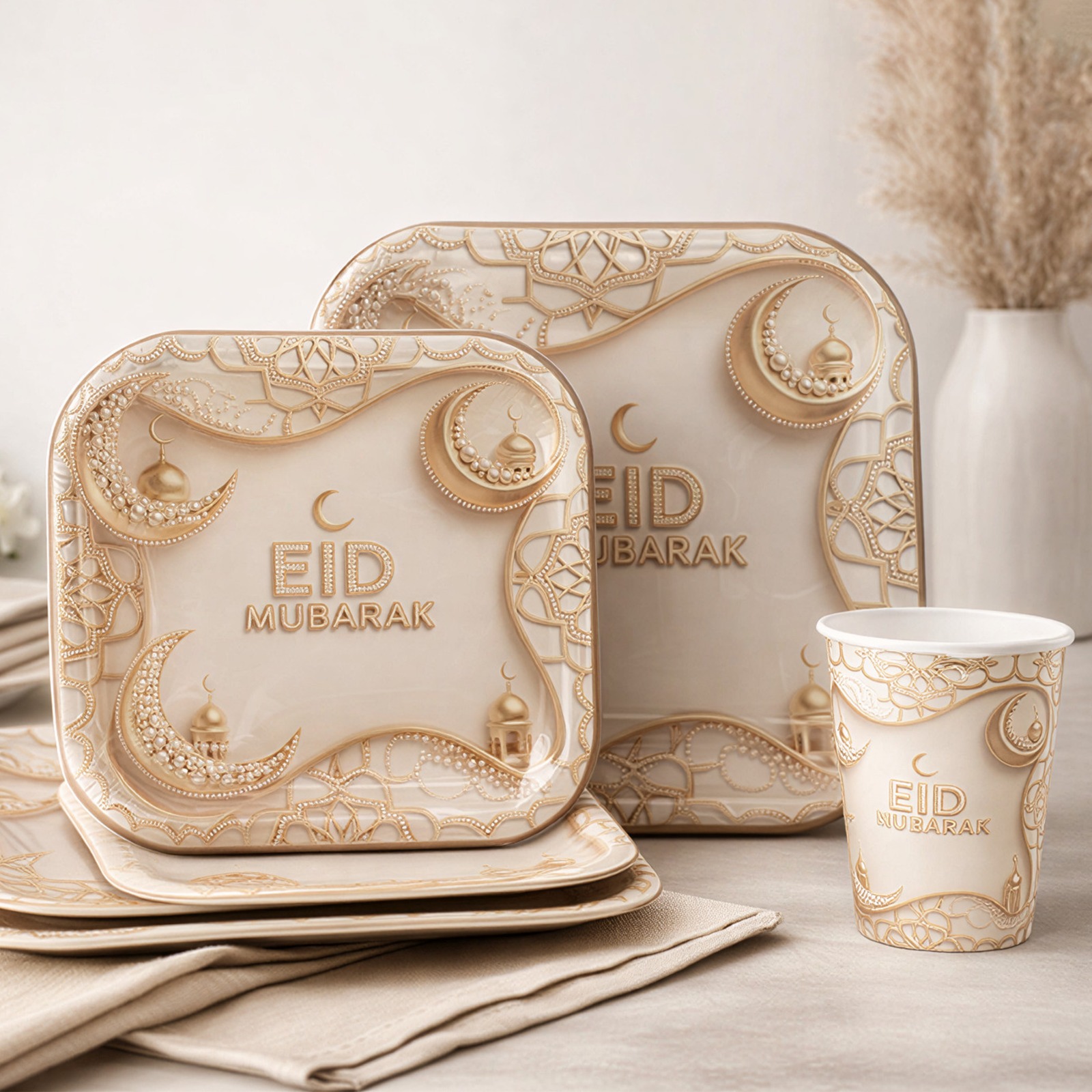 20 Disposable Big Plates,side Plates & Cups Eid Mubarak Gold is a practical food packaging option for takeaway meals, catering, parties and daily kitchen use.