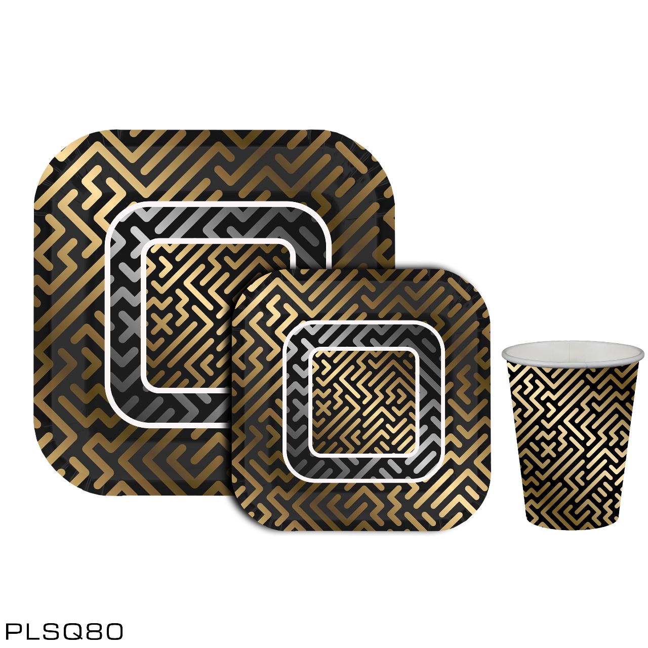 20 Disposable Big Plates,Side Plates&Cups Blk Gold Geometric